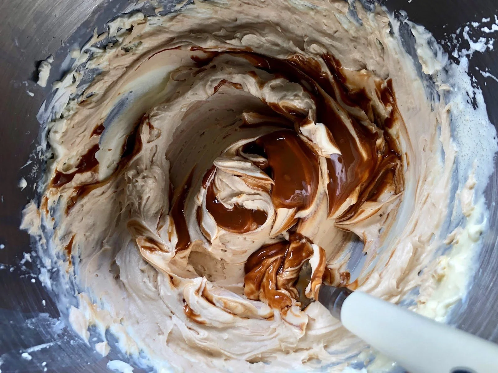 Den Mascarpone, das Haselnuss-Mus und die Nutella unterrühren. Zuletzt das geschlagene Eiweiß locker unterheben.