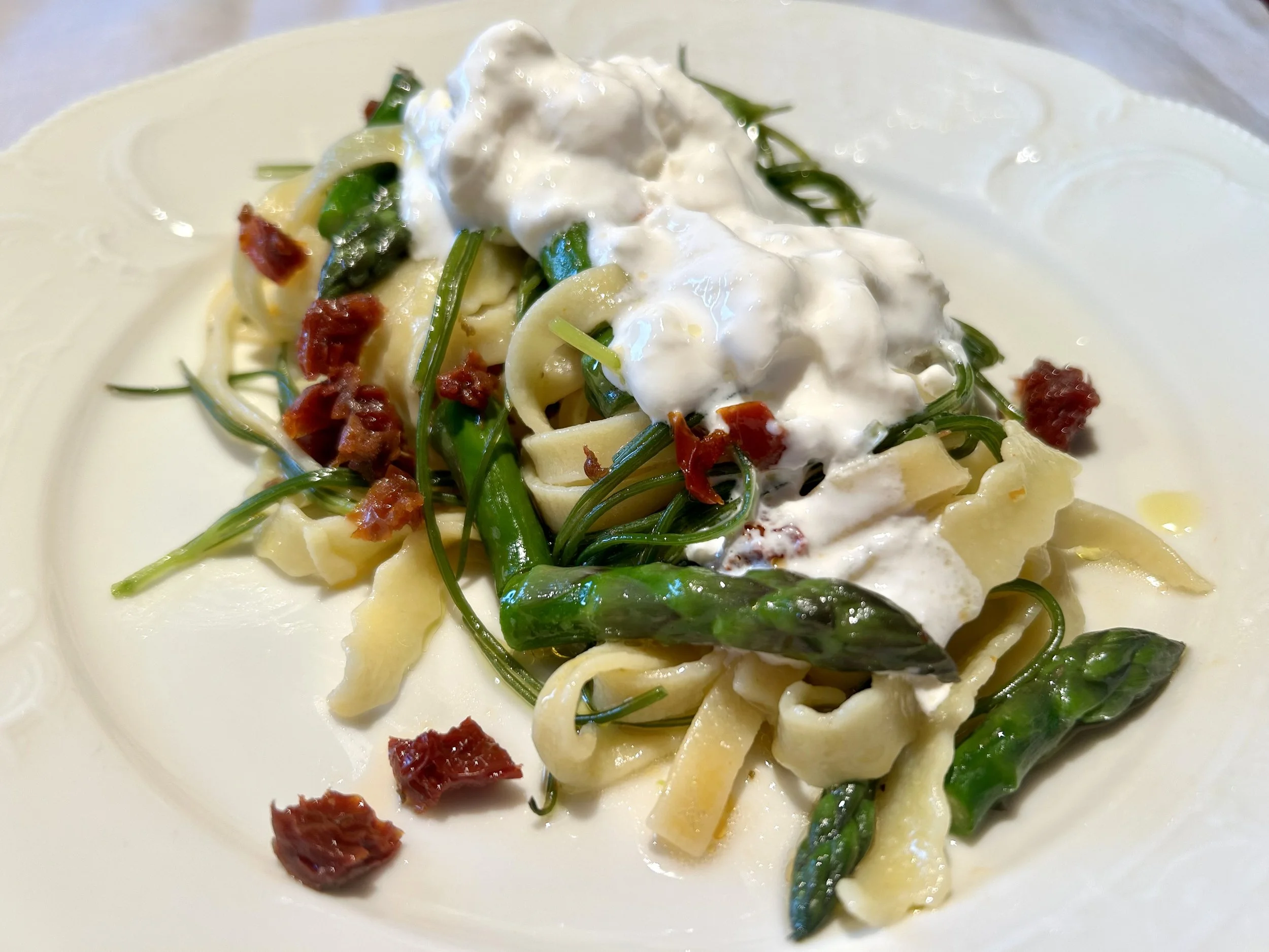 Tagliatelle mit Agretti, grünem Spargel und getrockneten Tomaten